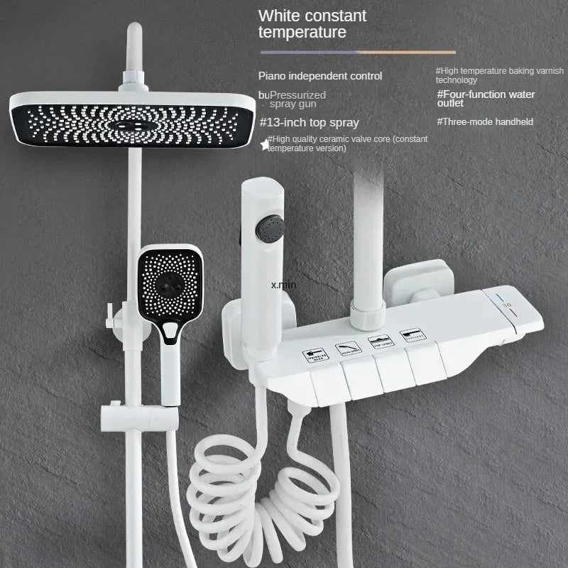 The White Piano Keys Shower Set combines luxury and functionality with a striking design. Featuring a brass construction and a modern white finish, this bathroom shower system includes a digital display and four versatile shower modes. The set provides an exceptional shower experience, blending high-end features with a sophisticated aesthetic to enhance your bathroom.