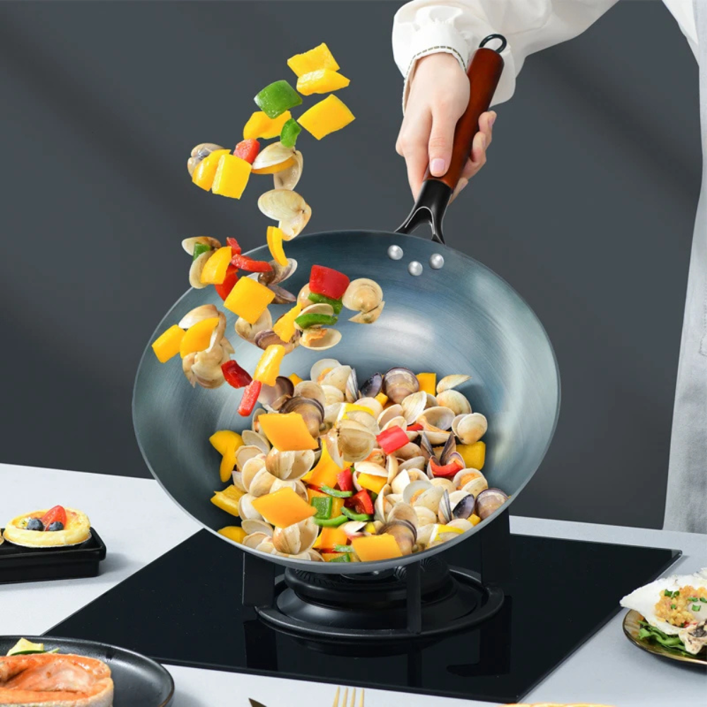 The wok is crafted using traditional Chinese craftsmanship, delivering the authentic wok-hei that connoisseurs love. The unique blue-iron surface reacts to high heat, imparting that unmistakable roasted flavor to your dishes. While many pans remain too cool or poorly retain heat, this wok brings out the full flavor of every ingredient. Cooking becomes not only more efficient but also more flavorful.